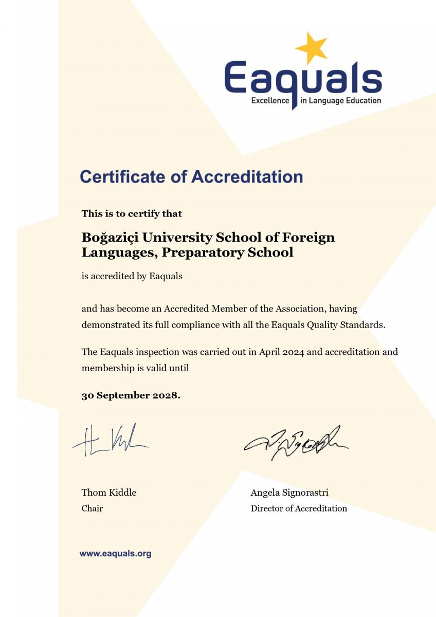 Aiming to provide the highest quality in teaching methods, curriculum design and general language education services, Boğaziçi University School of Foreign Languages (YADYOK) English Preparatory Unit started its efforts to be accredited by EAQUALS in the 2023-2024 academic year in order to prove the high quality language education it has been practicing for many years, to increase the international reputation of YADYOK and to make it more attractive to prospective students and faculty members worldwide, and was accredited by EAQUALS as a result of the accreditation visits organized in April 2024. Our institution was evaluated in the following areas: